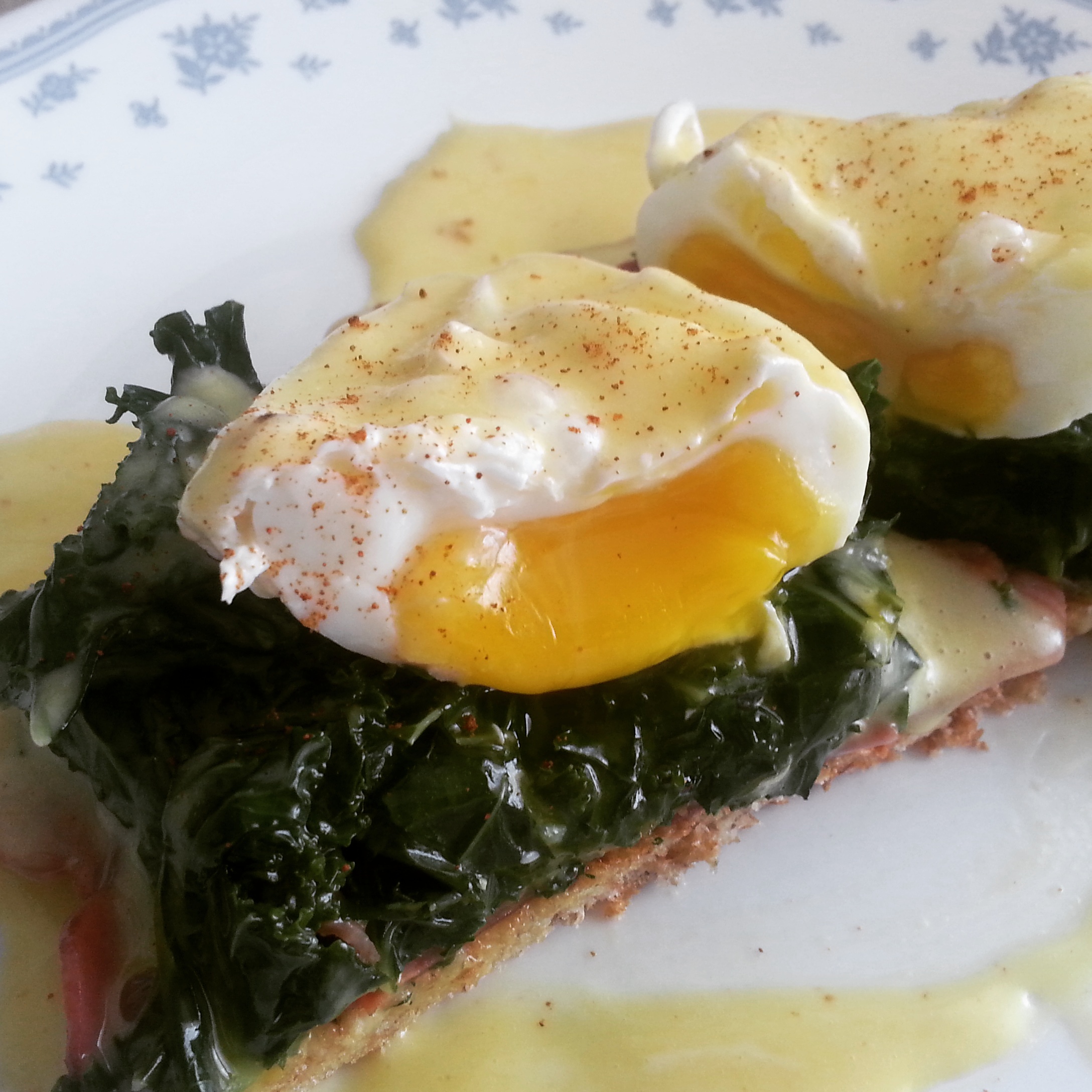 Stir in any extra warm water that your Hollandaise Sauce may need. Drain the kale well in a colander. On your plates, place the bread, bacon, and drained kale – in that order. Once the eggs are poached nestle them atop the kale. Pour Hollandaise over using the large spoon or rubber spatula. Season with salt and pepper/paprika to taste.