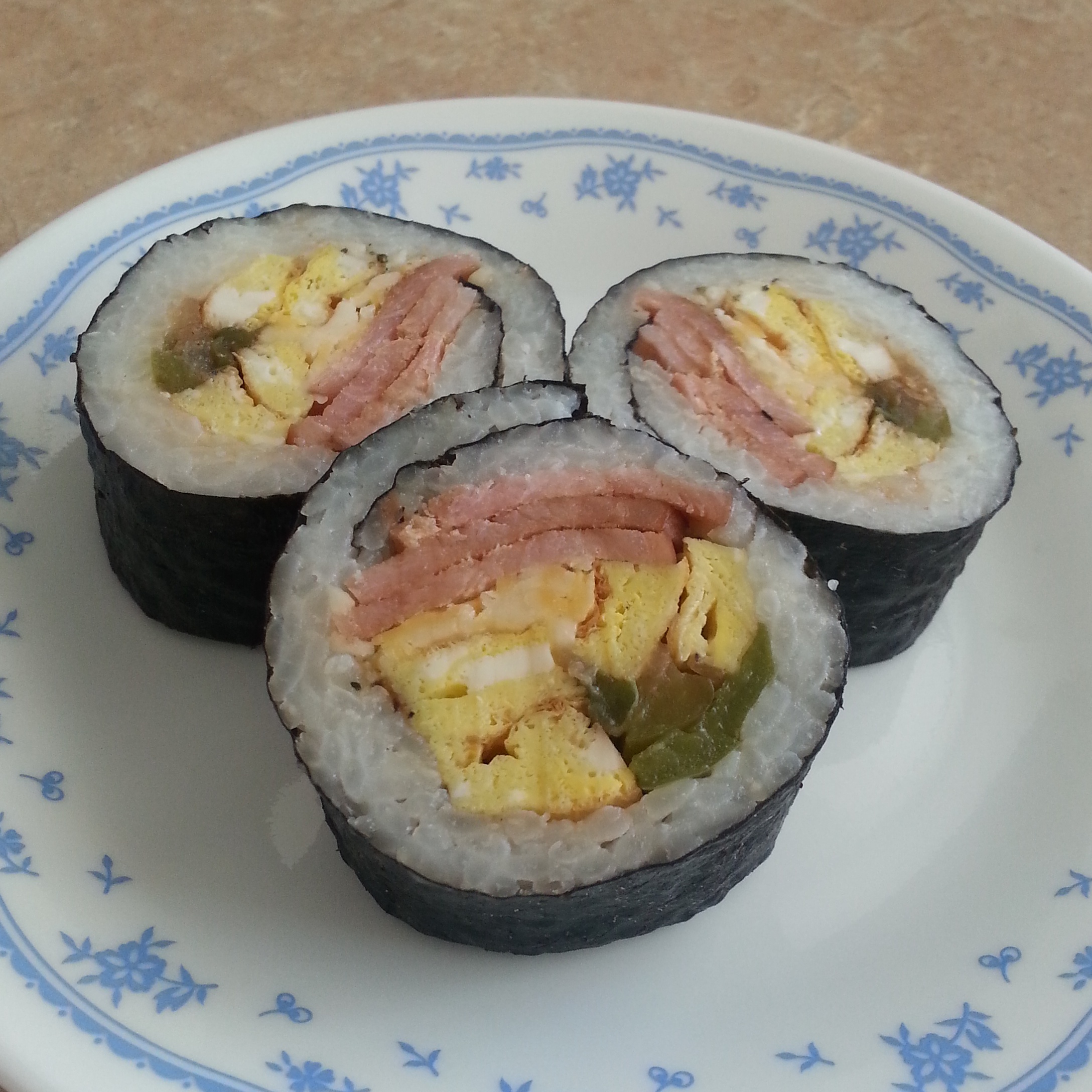 Once the rice and potato mixture has cooked properly, on cutting board place bamboo mat and 1 sheet of seaweed paper. Thinly spread on a layer of rice mixture. Next, lay on a 2-3 strips of egg, pepper & onion, 2 strips bacon, and some cheese.
